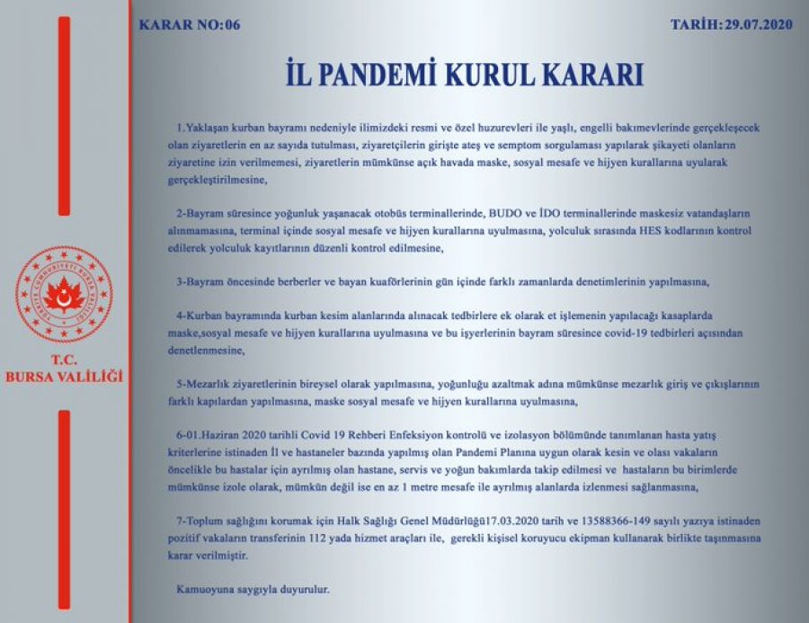 "1. Yaklaşan kurban bayramı nedeniyle ilimizdeki resmi ve özel huzurevleri ile yaşlı, engelli bakımevlerinde gerçekleşecek olan ziyaretlerin en az sayıda tutulması, ziyaretçilerin girişte ateş ve semptom sorgulaması yapılarak şikayeti olanların ziyaretine izin verilmemesi, ziyaretlerin mümkünse açık havada maske, sosyal mesafe ve hijyen kurallarına uyularak gerçekleştirilmesine,