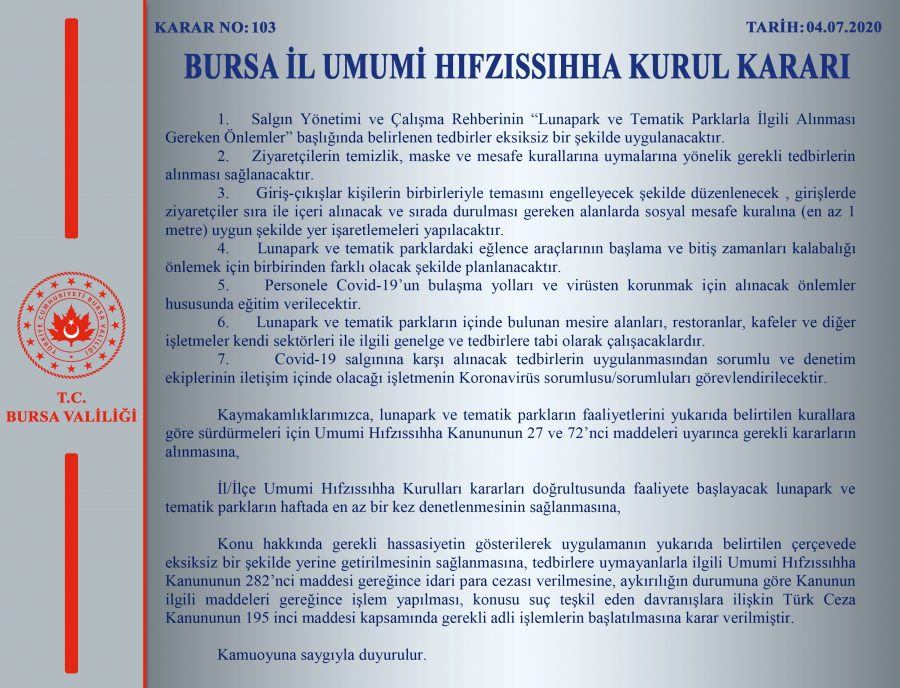İl/İlçe Umumi Hıfzıssıhha Kurulları kararları doğrultusunda faaliyete başlayacak lunapark ve tematik parkların haftada en az bir kez denetlenmesinin sağlanmasına,