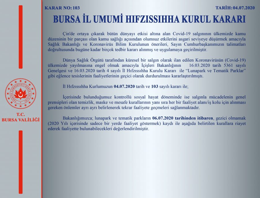 Dünya Sağlık Örgütü tarafından küresel bir salgın olarak ilan edilen Koronavirüsün (Covid-19) ülkemizde yayılmasına engel olmak amacıyla İçişleri Bakanlığının 16.03.2020 tarih 5361 sayılı Genelgesi ve 16.03.2020 tarih 4 sayılı İl Hıfzıssıhha Kurulu Kararı ile "Lunapark ve Tematik Parklar" gibi eğlence tesislerinin faaliyetlerinin geçici olarak durdurulması kararlaştırılmıştı.