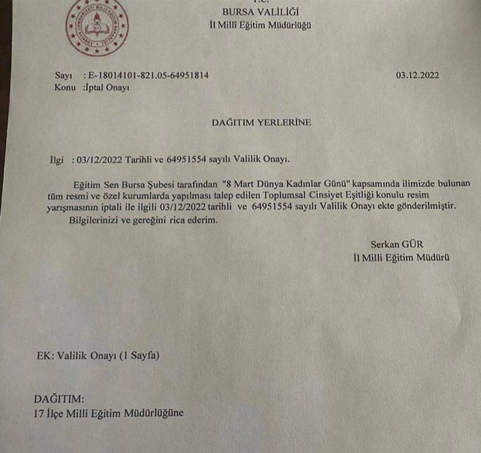 “Eğitim Sen Bursa Şubesi tarafından “8 Mart Dünya Kadınlar Günü” kapsamında ilimizde bulunan tüm resmi ve özel kurumlarda yapılması talep edilen Toplumsal Cinsiyet Eşitliği konulu resim yarışmasının iptali ile ilgili 03/12/2022 tarihli ve 64951554 sayılı Valilik Onayı ekte gönderilmiştir.”