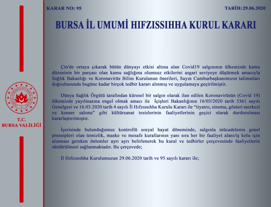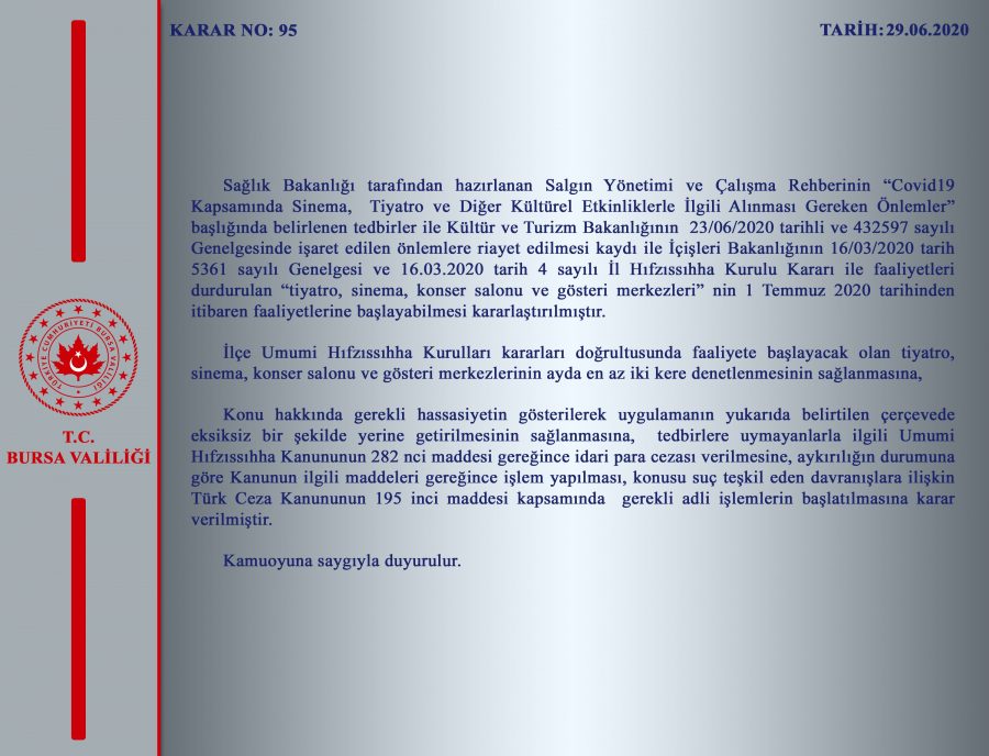 Sağlık Bakanlığı tarafından hazırlanan Salgın Yönetimi ve Çalışma Rehberinin "Covid19 Kapsamında Sinema, Tiyatro ve Diğer Kültürel Etkinliklerle İlgili Alinması Gereken Önlemler" başlığında belirlenen tedbirler ile Kültür ve Turizm Bakanlığının 23/06/2020 tarihli ve 432597 sayılı Genelgesinde işaret edilen önlemlere riayet edilmesi kaydı ile İçişleri Bakanlığının 16/03/2020 tarih 5361 sayılı Genelgesi ve 16.03.2020 tarih 4 sayılı İl Hıfzıssıhha Kurulu Kararı ile faaliyetleri durdurulan "tiyatro, sinema, konser salonu ve gösteri merkezleri" nin 1 Temmuz 2020 tarihinden itibaren faaliyetlerine başlayabilmesi kararlaştırılmıştır.