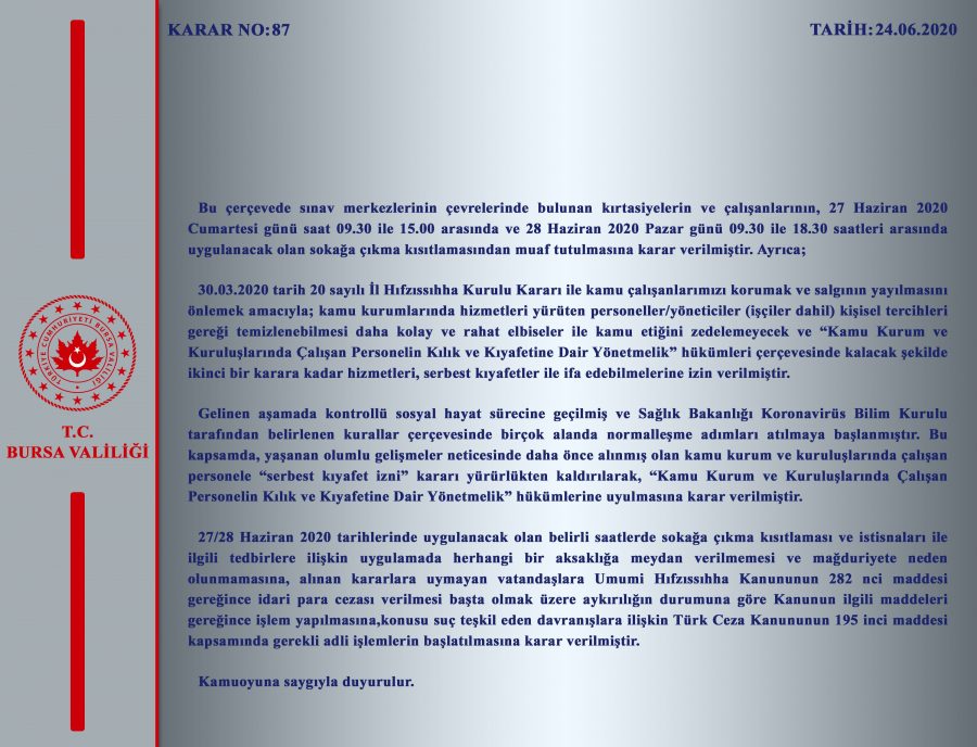 27 Haziran 2020 Cumartesi günü saat 09.30 ile 15.00 arasında ve 28 Haziran 2020 Pazar günü 09.30 ile 18.30 saatleri arasında belirtilen istisnalar hariç olmak üzere ilimiz sınırları içinde bulunan vatandaşlarımızın sokağa çıkmaları İçişleri Bakanlığının 18.06.2020 tarih 9863 sayılı Genelgesi ve 18.06.2020 tarih 85 sayılı İl Hıfzıssıhha Kurulu Kararı ile kısıtlanmıştır. İçişleri Bakanlığının 18.06.2020 tarih 9863 sayılı Genelgesi ve 18.06.2020 tarih 85 sayılı İl Hıfzıssıhha Kurulu Kararında belirlenen saatlerde sokağa çıkma kısıtlamasından muaf tutulacak yerler belirtilmiştir. Ancak;
