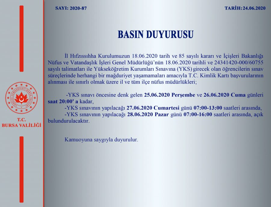 "İl Hıfzıssıhha Kurulumuzun 18.06.2020 tarih ve 85 sayılı kararı ve İçişleri Bakanlığı Nüfus ve Vatandaşlık İşleri Genel Müdürlüğü'nün 18.06.2020 tarihli ve 24341420-000/60755 sayılı talimatları ile Yükseköğretim Kurumları Sınavına (YKS) girecek olan öğrencilerin sınav süreçlerinde herhangi bir mağduriyet yaşamamaları amacıyla T.C. Kimlik Kartı başvurularının alınması ile sınırlı olmak üzere il ve tüm ilçe nüfus müdürlükleri;