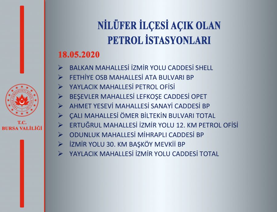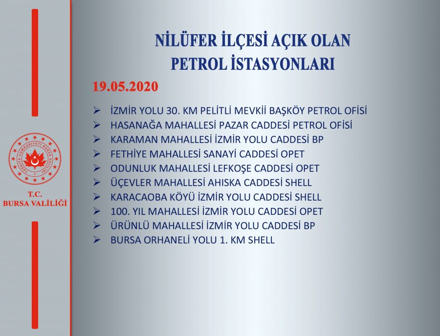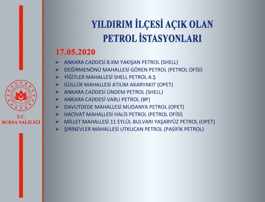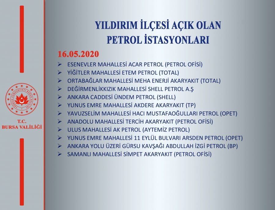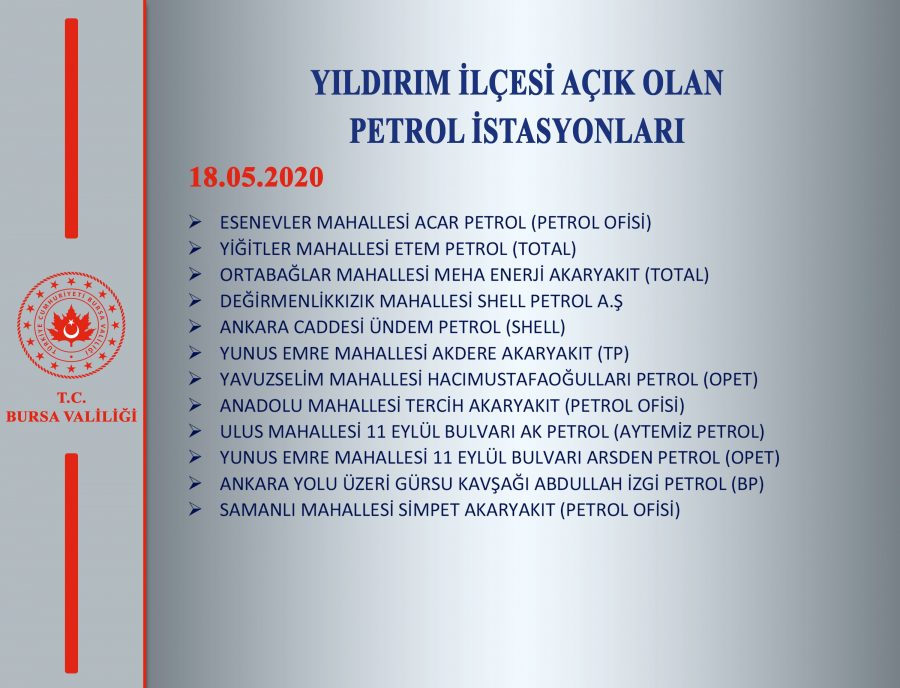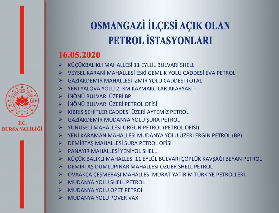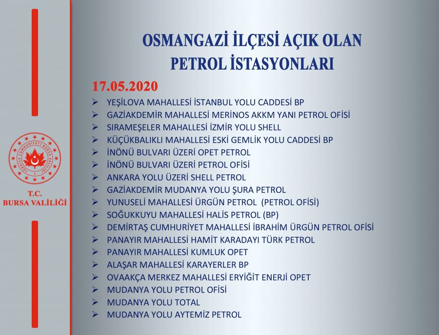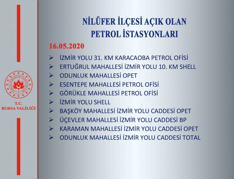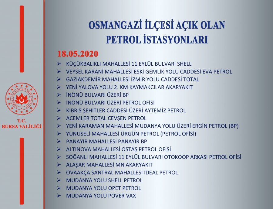 Bursa Valiliği'nden yapılan açıklamaya göre açık olacak olan benzin istansyonları: