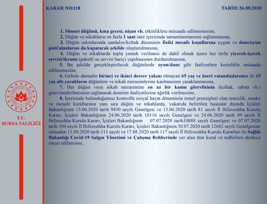 1. Sünnet düğünü, kına gecesi, nişan vb. etkinliklere müsaade edilmemesine, 2. Düğün ve nikahların en fazla 1 saat süre içerisinde tamamlanmasının sağlanmasına,