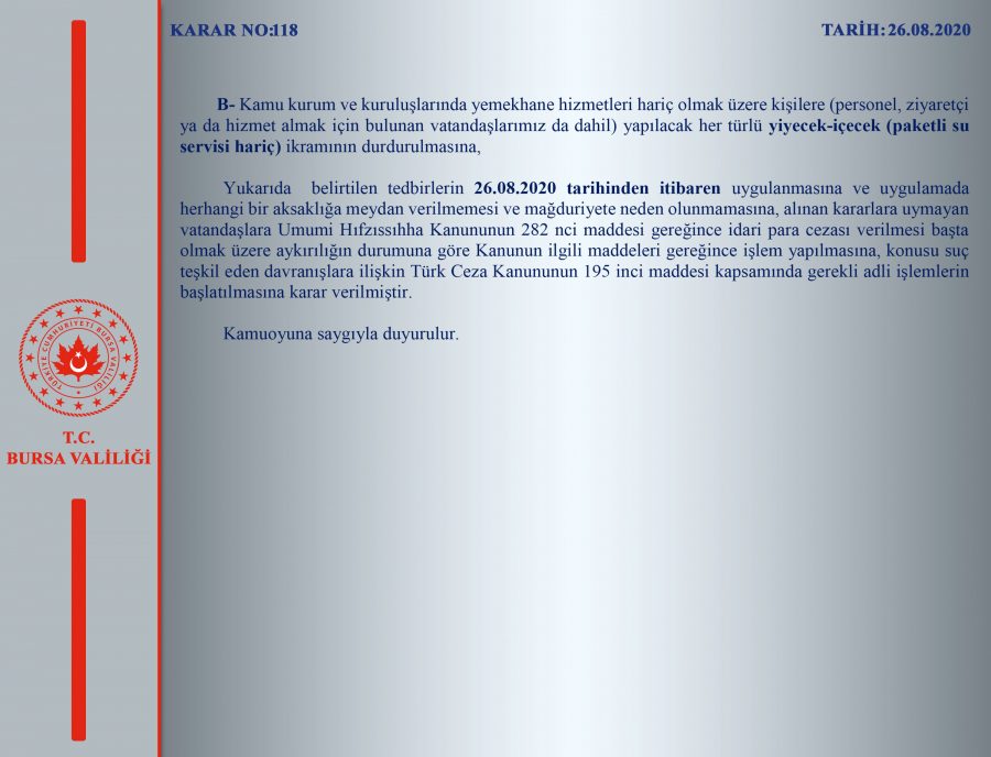 B- Kamu kurum ve kuruluşlarında yemekhane hizmetleri hariç olmak üzere kişilere (personel, ziyaretçi ya da hizmet almak için bulunan vatandaşlarımız da dahil) yapılacak her türlü yiyecek-içecek (paketli su servisi hariç) ikramının durdurulmasına,