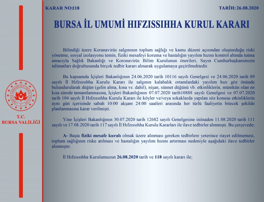 İl Hıfzıssıhha Kurulumuzun 26.08.2020 tarih ve 118 sayılı kararı ile