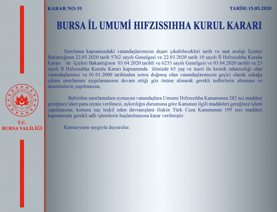 - İçişleri Bakanlığının 22.03.2020 tarih 5762 sayılı Genelgesi ve 22.03.2020 tarih 10 sayılı İl Hıfzıssıhha Kurulu Kararı ile ilimizde sokağa çıkmaları kısıtlanan 65 yaş ve üzeri ile kronik rahatsızlıkları olan vatandaşlarımızın ve ihtiyaç duyulan hallerde refakatçilerinin 17.05.2020 Pazar günü, 11.00-15.00 saatleri arasında yürüme mesafesiyle sınırlı olmak, sosyal mesafe kuralına riayet etmek ve maske takmak kaydıyla dışarı çıkabilmelerine,