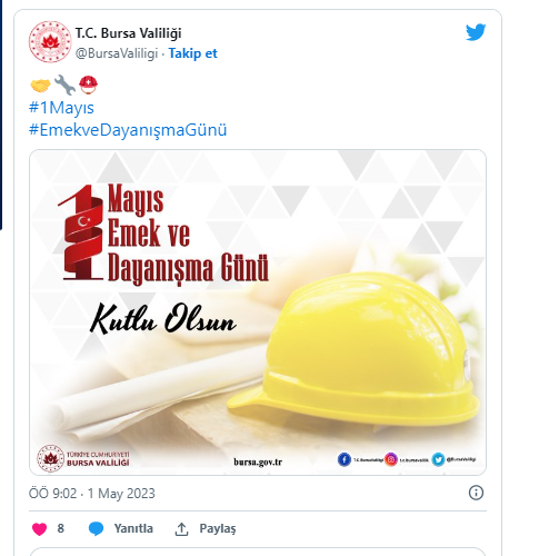 Bursa Valiliği Twitter hesabından işçi bayramını kutladı.