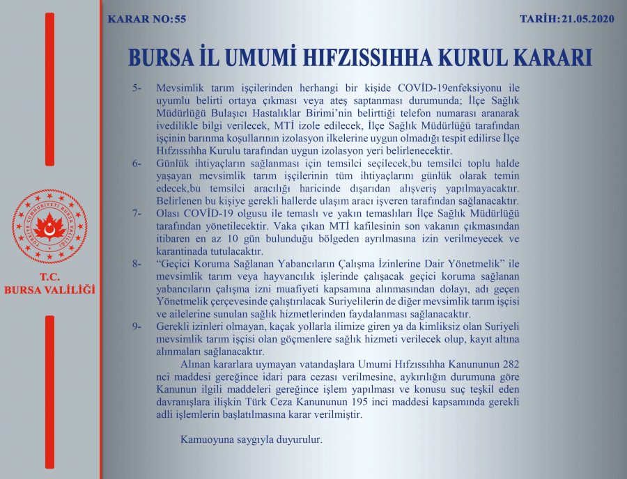 - Mevsimlik Tarım İşçilerinin yaşam alanları ve koşulları için 2017/ 6 sayılı Başbakanlık Genelgesinde ve İller İdaresi Genel Müdürlüğünün 25.03.2020 tarih ve 5863 sayılı talimatı ile 03.04.2020 tarih ve 6202 sayılı yazısında bahsi geçen tedbirlerin tamamı alınacaktır.