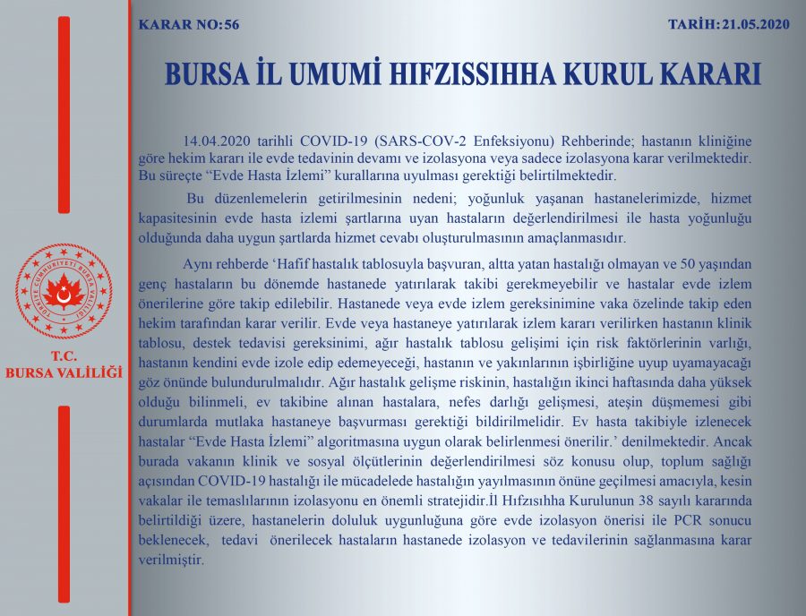 Aynı rehberde 'Hafif hastalık tablosuyla başvuran, altta yatan hastalığı olmayan ve 50 yaşından genç hastaların bu dönemde hastanede yatırılarak takibi gerekmeyebilir ve hastalar evde izlem önerilerine göre takip edilebilir. Hastanede veya evde izlem gereksinimine vaka özelinde takip eden hekim tarafından karar verilir. Evde veya hastaneye yatırılarak izlem kararı verilirken hastanın klinik tablosu, destek tedavisi gereksinimi, ağır hastalık tablosu gelişimi için risk faktörlerinin varlığı, hastanın kendini evde izole edip edemeyeceği, hastanın ve yakınlarının işbirliğine uyup uyamayacağı göz önünde bulundurulmalıdır. Ağır hastalık gelişme riskinin, hastalığın ikinci haftasında daha yüksek olduğu bilinmeli, ev takibine alınan hastalara, nefes darlığı gelişmesi, ateşin düşmemesi gibi durumlarda mutlaka hastaneye başvurması gerektiği bildirilmelidir. Ev hasta takibiyle izlenecek hastalar "Evde Hasta İzlemi" algoritmasına uygun olarak belirlenmesi önerilir.' denilmektedir. Ancak burada vakanın klinik ve sosyal ölçütlerinin değerlendirilmesi söz konusu olup, toplum sağlığı açısından COVID-19 hastalığı ile mücadelede hastalığın yayılmasının önüne geçilmesi amacıyla, kesin vakalar ile temaslılarının izolasyonu en önemli stratejidir.İl Hıfzısıhha Kurulunun 38 sayılı kararında belirtildiği üzere, hastanelerin doluluk uygunluğuna göre evde izolasyon önerisi ile PCR sonucu beklenecek, tedavi önerilecek hastaların hastanede izolasyon ve tedavilerinin sağlanmasına karar verilmiştir.