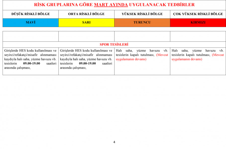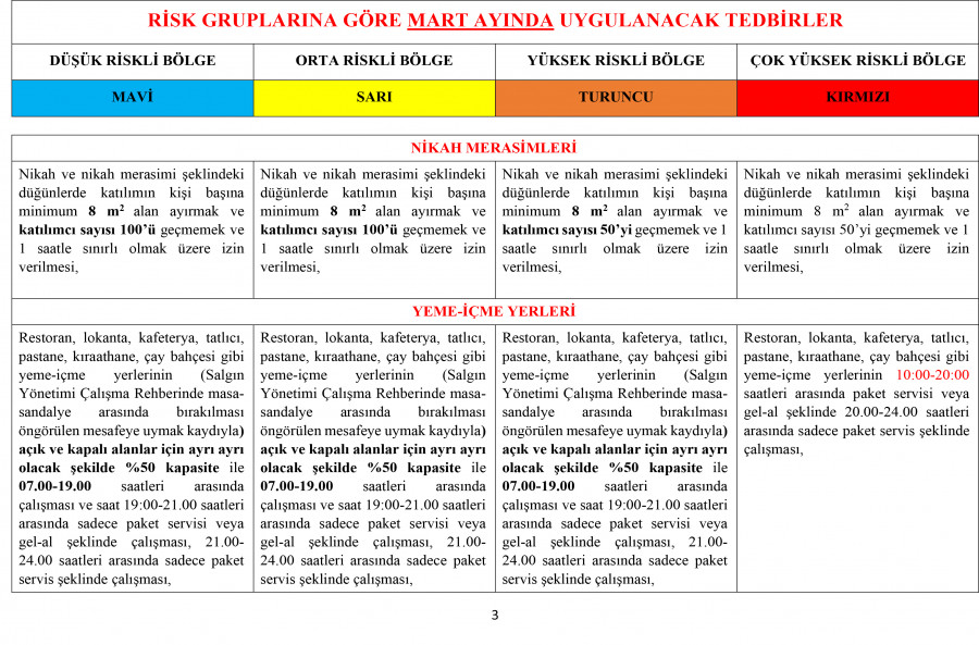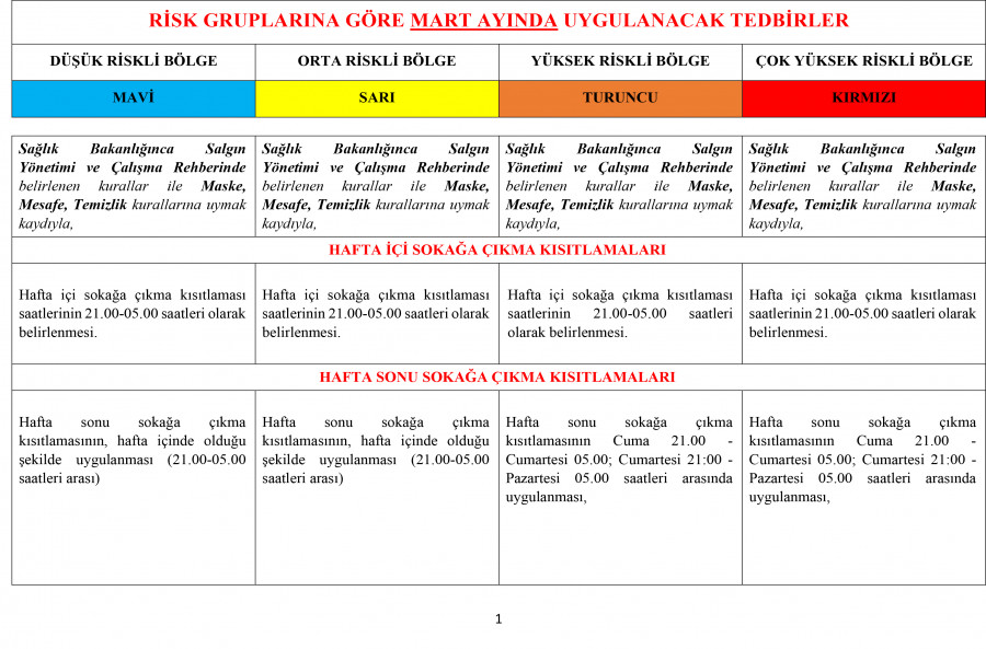 1.Sağlık Bakanlığı ve Koronavirüs Bilim Kurulu tarafından tespit edilen kriterlere göre iller 4 ayrı risk grubuna (düşük, orta, yüksek, çok yüksek) ayrılarak salgınla mücadeledeki tedbir seviyeleri risk gruplarına göre belirlenecektir.