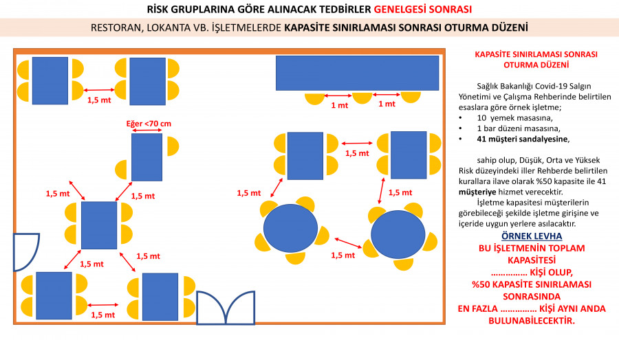 Covid19 Salgın Yönetimi ve Çalışma Rehberindeki mesafe kuralları ile Ek1'de yer alan tabloda belirtilen kapasite kullanım oranlarına göre her bir yemeiçme yeri için Ek2'de örneği verilen oturma düzeni planı hazırlanacak ve içeride aynı anda bulunacak müşteri sayısı müşterilerin içeriden ve dışarıdan rahatlıkla görebileceği şekilde ilan edilmesine,