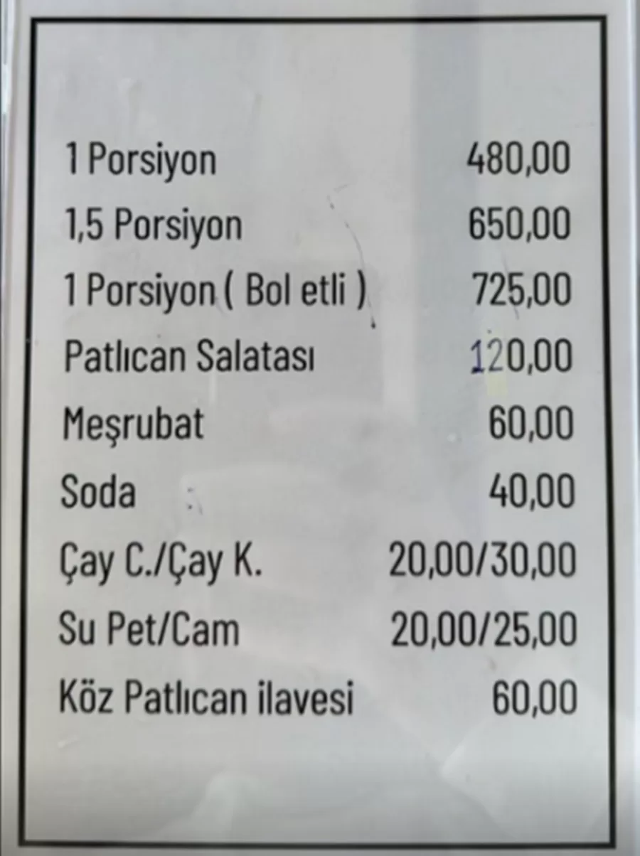 Küresel ekonomik krizin Türkiye'deki et fiyatlarını olumsuz etkilemesi, restoran menülerine de yansıdı. Bursa'da bulunan ünlü bir iskenderci, menüsündeki fiyatlarla gündem oluşturdu. Bir porsiyon iskender için 480 lira talep edilirken etin biraz daha bol olduğu versiyonu için ise 725 lira isteniyor. Bu durum, kısa sürede geniş çapta tartışmalara neden oldu.