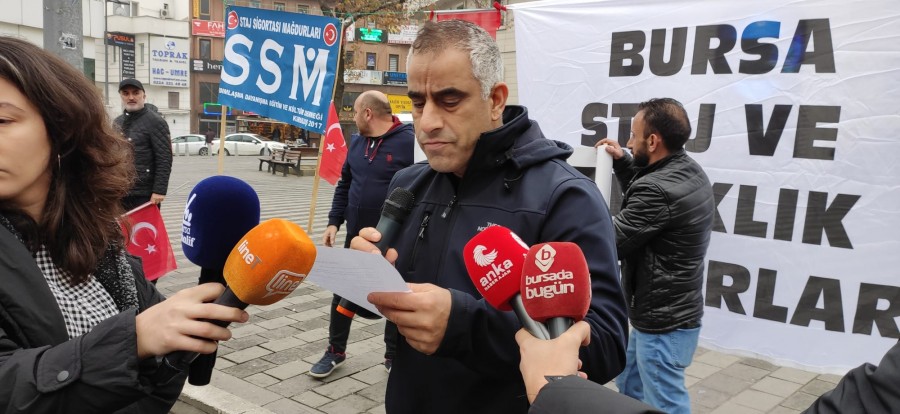 Staj ve çıraklık mağduru Murat Beyazkuş dernek adına şöyle konuştu,"Bursa staj ve çıraklık sigorta staj mağdurları olarak burada toplanmış bulunmaktayız. Bursa'da bizler ve Türkiye'de 1,5 milyon kişi bu haksız ve vicdanları yaralayan bu haksız uygulamanın son bulması için mücadele ediyoruz."