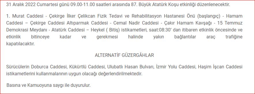 "1. Murat Caddesi - Çekirge İlker Çelikcan Fizik Tedavi ve Rehabilitasyon Hastanesi Önü (başlangıç) - Hamam Caddesi - Çekirge Caddesi Altıparmak Caddesi - Cemal Nadir Caddesi - Çakır Hamam Kavşağı - 15 Temmuz Demokrasi Meydanı - Atatürk Caddesi - Heykel ( Bitiş) istikametleri, saat:08:30’ dan itibaren etkinlik öncesinde ve etkinlik bitinceye kadar ve gerekmesi halinde yakın bağlantılar araç trafiğine kapatılacaktır. Sürücülerin Doburca Caddesi, Kükürtlü Caddesi, Ulubatlı Hasan Bulvarı, İzmir Yolu Caddesi, Haşim İşcan Caddesi istikametlerini kullanmalarının uygun olacağı değerlendirilmektedir."
