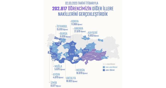 Bakan Özer, “Deprem sonrasında nakil yaptıran 202 bin 815 öğrencimizden 66 bin 914 öğrenciyle en fazla Hatay'dan diğer illere nakil yapıldığını görüyoruz. Hatay'dan sonra en fazla öğrenci nakli alınan il 50 bin 245 öğrenciyle Kahramanmaraş. Malatya 36 bin 900, Adıyaman 21 bin 629, Gaziantep 13 bin 706, Osmaniye 3 bin 853, Adana 3 bin 635, Diyarbakır 2 bin 808, Şanlıurfa 2 bin 803, Kilis'ten ise 322 öğrenci başka illere nakil yaptırdı” dedi.