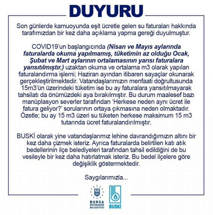 "Son günlerde kamuoyunda eşit ücretle gelen su faturaları hakkında tarafımızdan bir kez daha açıklama yapma gereği duyulmuştur.