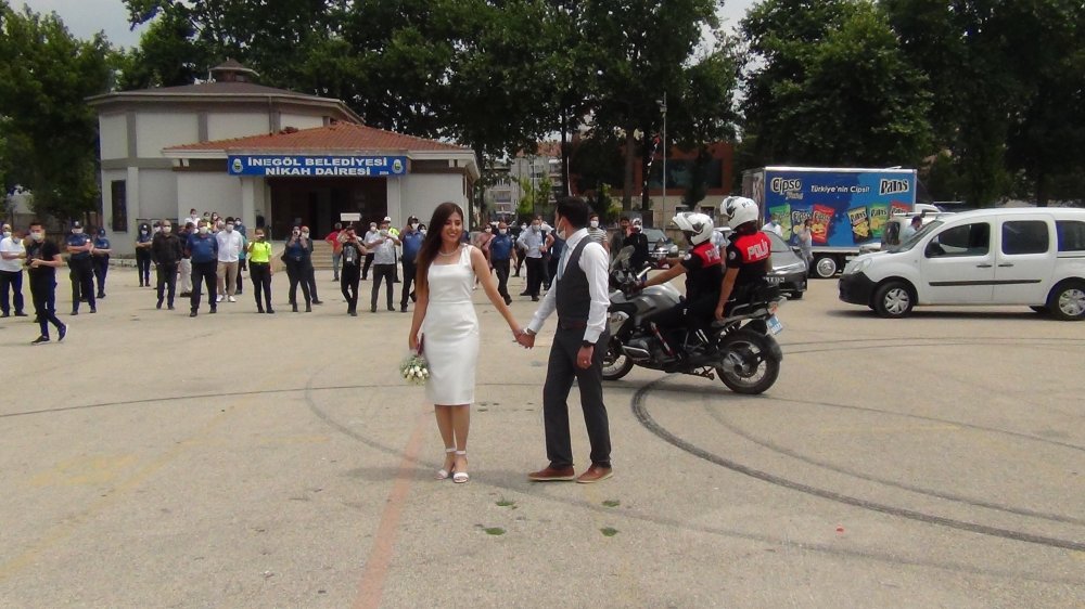 İlginç düğün, İnegöl ilçesinde gerçekleşti. Polis Akademisinde tanışan Merve Kılıç (27) ve Muhammed Mustafa Ayhan (29) İnegöl ilçesinde birlikte görev yapmaya başladı. Arkadaş olan çift bir süre sonra evlenmeye karar verdi. Komiser yardımcısı genç çiftin nikahı polis arkadaşları ve amirlerinin katılımıyla gerçekleşti.