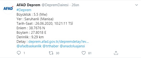 AFAD'ın geçtiği son dakika bilgilerine göre, saat 10.21'de merkez üssü Manisa'nın Saruhanlı ilçesi olan 5,5 büyüklüğünde deprem meydana geldiğini bildirdi.