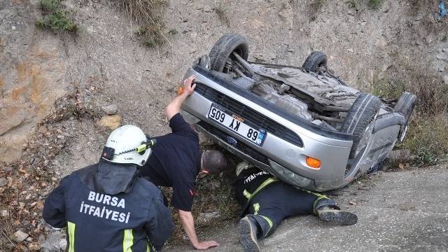 Ters dönün özel otomobilde şans eseri yara almayan sürücü otomobilin ön camını kırarak araçtan çıktı.