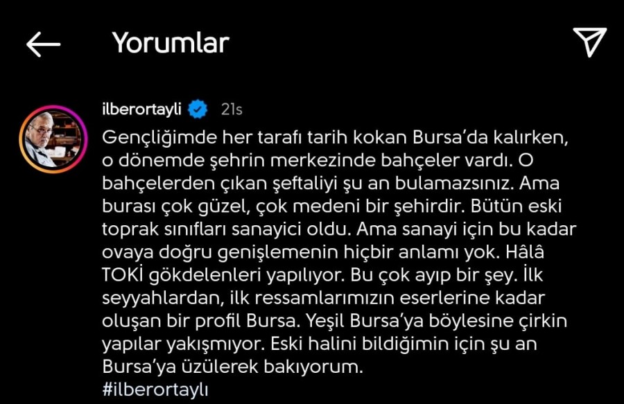 Prof. Dr. İlber Ortaylı Instagram hesabından Bursa ile ilgili paylaşımda bulundu. Bursa'da sıkça tartışılan Doğanbey TOKİ konutlarının Bursa'ya hiç yakışmadığını dile getiren Ortaylı, ''Bursa'ya üzülerek bakıyorum'' ifadelerini kullandı.