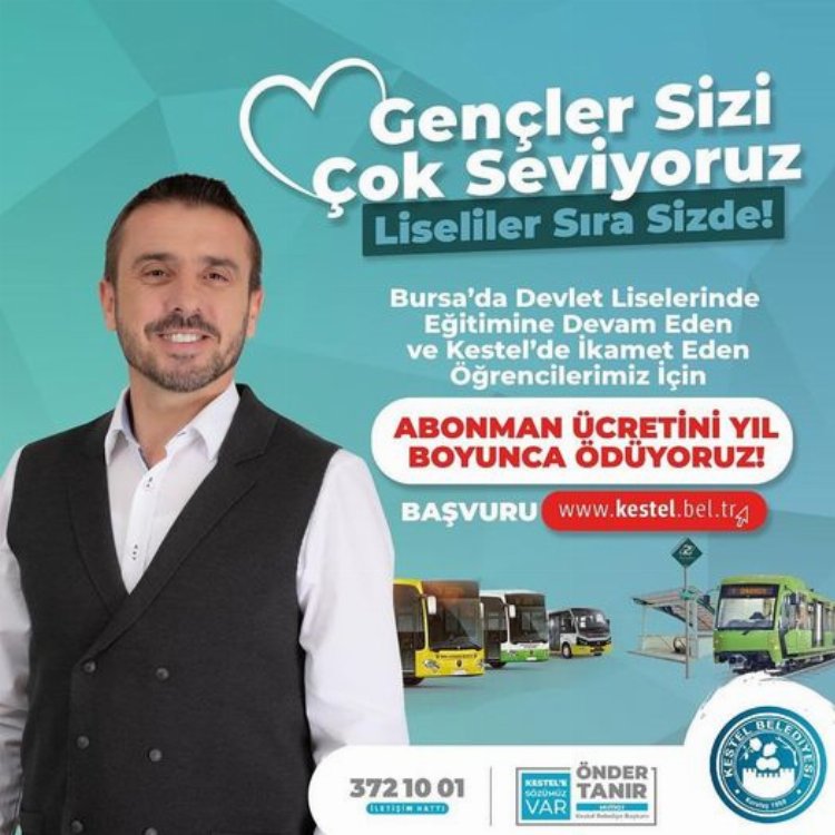 “Bursa’da devlet liselerinde eğitimlerini sürdüren ve Kestel’de ikamet eden öğrencilerimizin aylık BuKart Abonman ücretlerini Kestel Belediyesi olarak ödüyoruz. Sizi çok seviyoruz gençler” sözleriyle gençlere önemli bir hizmeti daha faaliyete geçirdi.