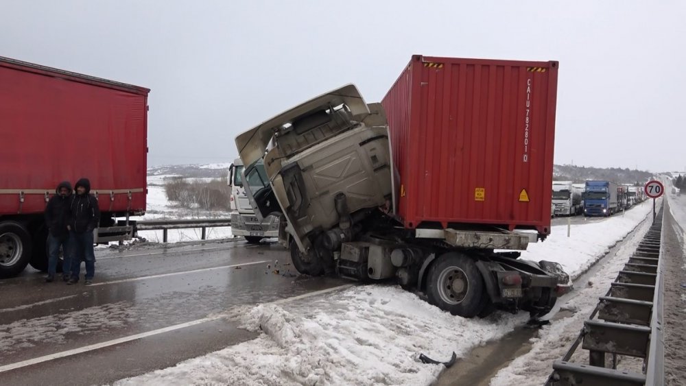 Şiddetini arttıran kar yağışı sonrası kazalar yaşandı. Bursa-İzmir karayolu 40. kilometrede 16 ZB 098 plakalı tır aynı yönde seyreden 06 PTH 64 plakalı tıra arkadan çarptı. Çarpmanın etkisiyle kontrolden çıkan 16 ZB 098 plakalı tır, ters dönerek yol kenarındaki refüje düştü. Kaza sonrası Bursa-İzmir karayolu ulaşıma kapandı. Diğer sürücülerin ihbarı üzerine kaza mahalline polis, jandarma ve sağlık ekibi yönlendirildi. Olay yerine gelen sağlık ekipleri hafif yaralı sürücüleri ayakta tedavi etti. Polis ekipleri yaptıkları inceleme sonrası kaza yerine vinç çağırarak kaza yaparak ters dönen tırı kaldırmak için çalışma başlattı. Kaza nedeniyle karayolunda kilometrelerce araç kuyruğu oluştu. Uzun araç kuyruğu dronla havadan görüntülendi. Vinç yardımıyla kaldırılan tır otoparka çekilirken kapanan Bursa-İzmir karayolu yaklaşık 2 saatin ardından tekrar araç trafiğine açıldı. Belediye ve karayollarına bağlı ekiplerin ise ana arterler, köy yolları ve tali yollardaki küreme ve tuzlama çalışmalarını aralıksız sürdürdüğü öğrenildi.