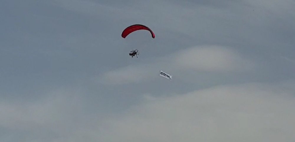 Paramotor pilotu İbrahim Dinçer, her gün ilçe semalarında uçarak paramotorun arkasına astığı pankartla sosyal mesaj veriyor. Paramotor ilçenin üzerinde her gün 1 saat uçuş yapıyor.