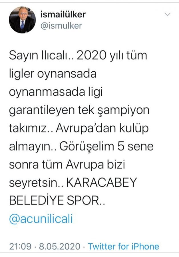 Karacabey Belediyespor Başkanı İsmail Ülker, Avrupa'dan futbol kulübü satın alacağı yönünde haberler çıkan ünlü televizyoncu Ilıcalı'ya bir tweet atarak, "Sayın Ilıcalı, gelin görüşelim, 5 sene sonra tüm Avrupa, Karacabey'i seyretsin" diye çağrıda bulundu.
