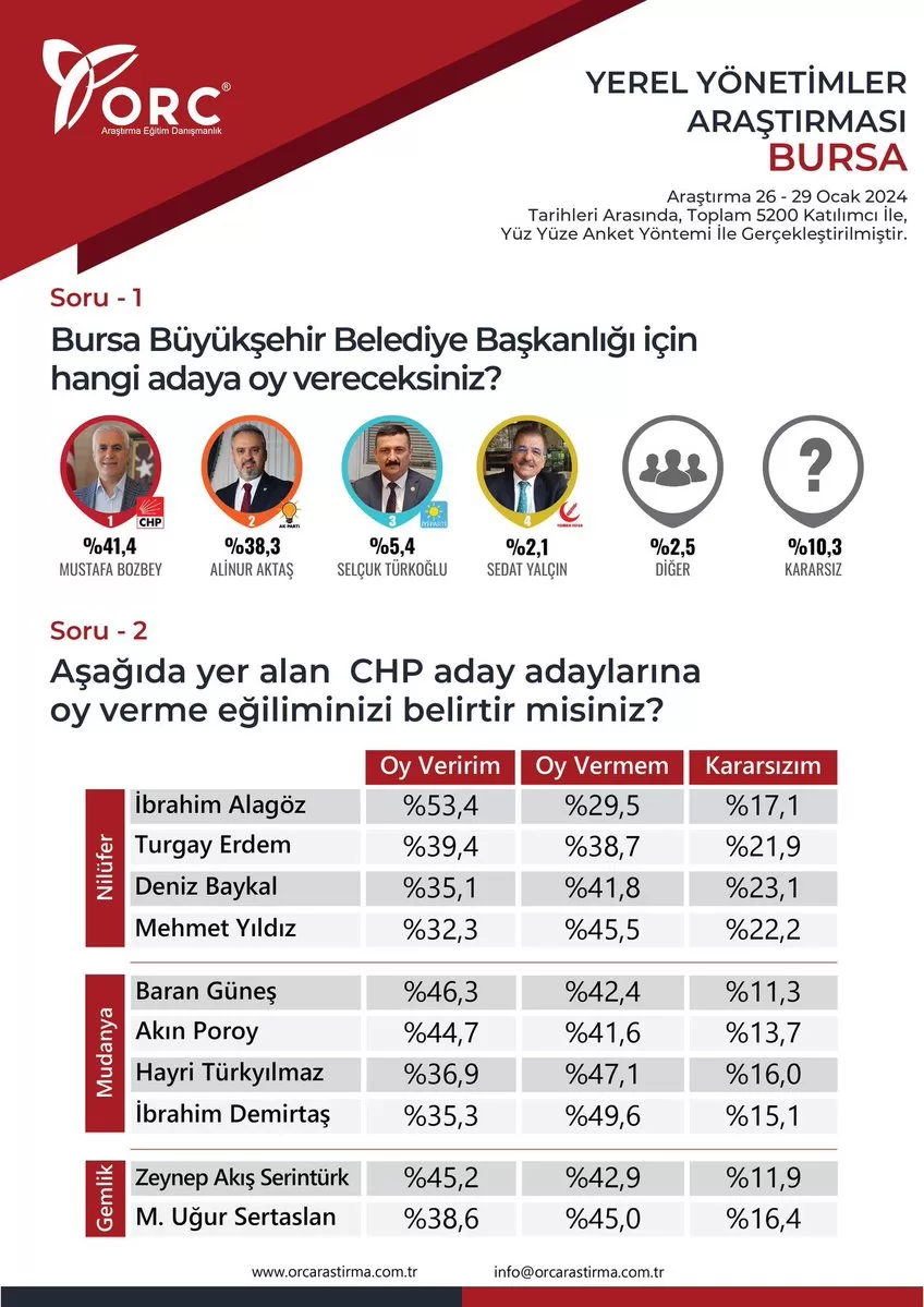 ORC, Bursa BBŞ için hangi adaya oy vereceksiniz anket sonucunda Mustafa Bozbey, %41,4 ile zirvede yer aldı. MHP ve ak Parti adayı mevcut başkan Alinur Aktaş %38,3 oy aldı. İyi Parti adayı selçuk Türkoğlu %5,4 oy alabildi. Kararsızlar %10'da kalırken, diğer diyenlerin sayısı %2.5 olarak belirlendi.