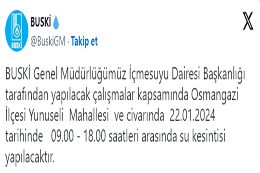 Bursa, Osmangazi İlçesi'nde, BUSKİ Genel Müdürlüğü İçmesuyu Dairesi Başkanlığı tarafından planlanan çalışmalar kapsamında, geçici bir içmesuyu kesintisi gerçekleştirilecek.