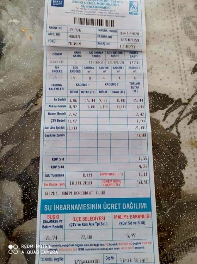 Söz konusu faturada en yüksek kalemi 21 TL ile katık atık toplama bedeli oluştururken, 2872 Sayılı Çevre Kanunu gereği su faturaları ile toplanan bu bedel BUSKİ ya da Büyükşehir Belediyesi'nin kasasına değil doğrudan ilçe belediyelerine aktarılmaktadır. Bursa Büyükşehir Belediyesi BUSKİ Genel Müdürlüğü'nün bir gelir kalemi olmamasına rağmen katı atık toplama bedelleri nedeniyle yüksek gelen faturaları üzerinden sürekli spekülasyon yapılırken, Bursa'da su fiyatlarının yüksek olduğu izlenimi verilmeye çalışılmaktadır.