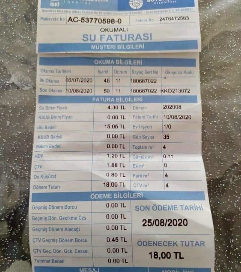 Özeren'in paylaşımında da görüldüğü gibi İstanbul'da suyun metreküp fiyatı 4.30 TL iken, Bursa'da ise 3,86 TL.