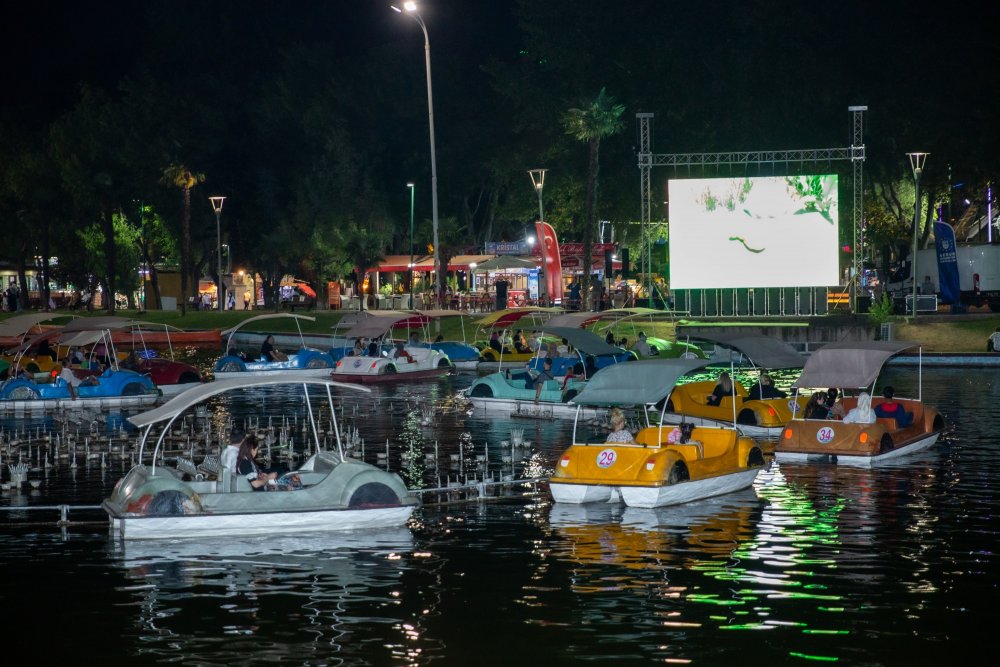 Millet Bahçesi’nde açık hava sineması ve Yunuseli Havaalanı otoparkında da arabalı sinema etkinlikleriyle vatandaştan büyük beğeni toplayan Kültür ve Sosyal İşler Dairesi Başkanlığı, bu kez sinemayı göl üstüne taşıdı. Karagöz Sinema Atölyesi'nin düzenlediği Kültürpark göl üstünde sinema keyfi etkinliği vatandaşlardan yoğun ilgi gördü. Sinemaseverler göl girişinde ellerini dezenfekte ettikten sonra su bisikletlerine binerek, sinema perdesi önündeki yerlerini aldı. Gerek su bisikletlerinde gerekse de göl kenarlarına oturan yaklaşık 300 kişi 'Evliya Çelebi Ölümsüzlük Suyu' adlı filmi keyifle izledi.