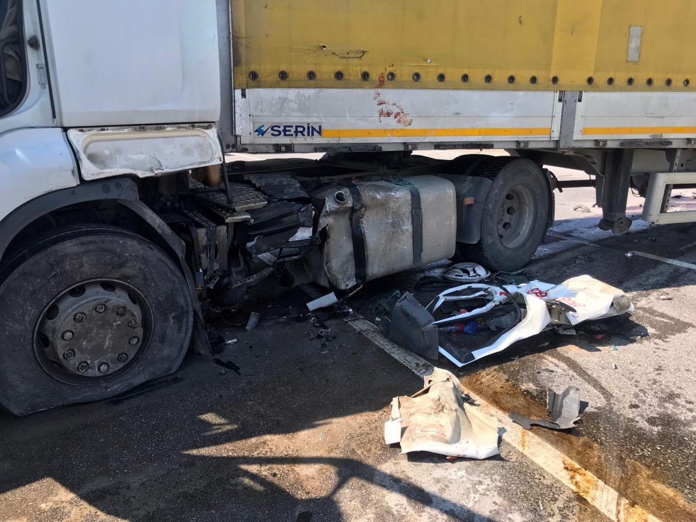 Edinilen bilgiye göre, Şenol A. idaresindeki 16 HAL 12 plakalı Tır, sağ şeritten Bursa istikametine dönmek isterken sol şeritte bulunan araç taşıyan çekiciyle çarpıştı.