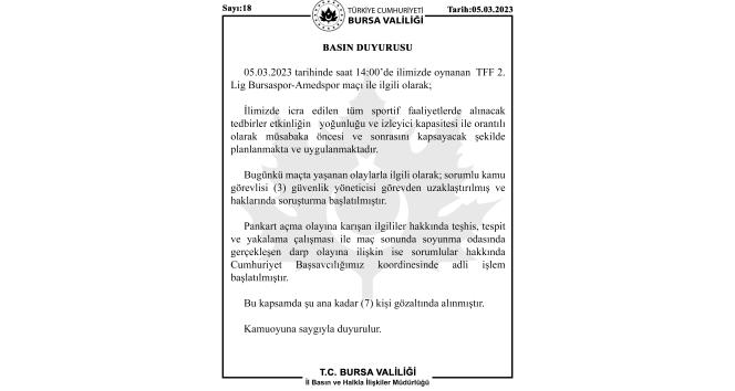 Bursa Valiliği'nden yapılan açıklama şu şekilde: “05.03.2023 tarihinde saat 14:00'de ilimizde oynanan TFF 2. Lig Bursaspor-Amedspor maçı ile ilgili olarak; İlimizde icra edilen tüm sportif faaliyetlerde alınacak tedbirler etkinliğin yoğunluğu ve izleyici kapasitesi ile orantılı olarak müsabaka öncesi ve sonrasını kapsayacak şekilde planlanmakta ve uygulanmaktadır. Bugünkü maçta yaşanan olaylarla ilgili olarak; sorumlu kamu görevlisi (3) güvenlik yöneticisi görevden uzaklaştırılmış ve haklarında soruşturma başlatılmıştır. Pankart açma olayına karışan ilgililer hakkında teşhis, tespit ve yakalama çalışması ile maç sonunda soyunma odasında gerçekleşen darp olayına ilişkin ise sorumlular hakkında Cumhuriyet Başsavcılığımız koordinesinde adli işlem başlatılmıştır. Bu kapsamda şu ana kadar (7) kişi gözaltında alınmıştır. Kamuoyuna saygıyla duyurulur.”