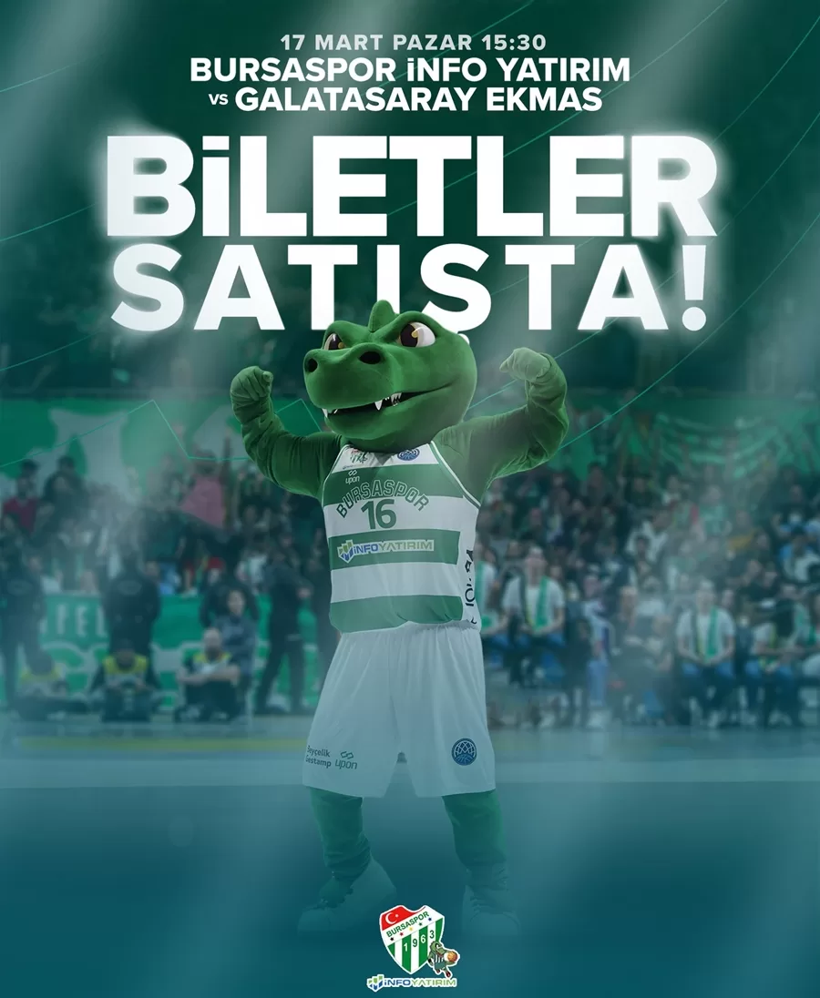 Bursaspor, Basketbol Erkekler Süper Ligi 23. haftasında 17 Mart Pazar günü TOFAŞ Nilüfer Spor Salonu'nda Galatasaray Ekmas ile karşılaşacak. Bu heyecan verici mücadele için biletler satışa çıktı ve Yeşil Beyazlı taraftarlar, maçı canlı izlemek için sabırsızlanıyor.