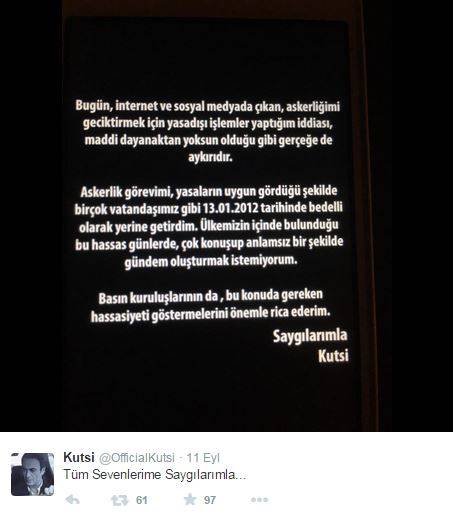 Geçtiğimiz günlerde sahte çürük raporu alarak askerlikten kaçtığı dedikodularıyla gündeme bomba gibi düşen ve hakkında 18 yıldan 51 yıla kadar hapis istenen şarkıcı Kutsi, iddiaları yalanladı.