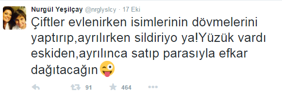 Oyuncu resmi twitter hesabından, 'Çiftler evlenirken isimlerinin dövmelerini yaptırıp, ayrılırken sildiriyor ya! Yüzük vardı eskiden, ayrılınca satıp parasıyla efkar dağıtacağın' sözleriyle çiftlere manidar bir göndermede bulundu.