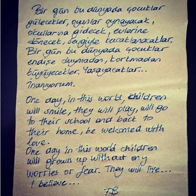 Bodrum'da, cesedi kıyıya vuran 3 yaşındaki Suriyeli mülteci Aylan'ın yürek yakan görüntüsü oyuncu Tuba Büyüküstün'ü de üzüntüye boğdu. İki çocuk annesi olan oyuncu konuyla ilgili bir mektup kaleme aldı ve bu mektubu #peaceforchildren (çocuklar için barış) etiketi ile Türkçe ve İngilizce olarak yayınladı.