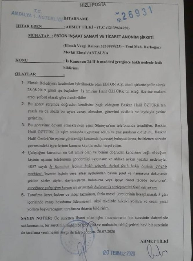 "10 Nisan 2019'da eşim Sümeyra ile evlendik. Nikâhımızı Elmalı Belediye Başkanı Halil Öztürk kıydı. 28 Ağustos 2019'da da beni makam şoförü olarak işe aldı. Bu görevim devam ederken, eşim Sümeyra'nın telefonunda tesadüfen Başkan Halil Öztürk ile uygunsuz resim ve yazışmaların olduğunu gördüm. Başkan Öztürk'ün eşime gönderdiği konumda buluştuklarını, belirlenen adresin çevresindeki kamera kayıtlarından tespit ettim. Çalıştığım kurumun en üst amiri olan ve benim doğrudan kendisine bağlı olduğum kişinin eşimin telefonuna gönderdiği uygunsuz ve ahlaka aykırı yazılar nedeniyle sözleşmemi fesih ediyorum." Tilki ihtarnamenin görüntüsünü sosyal medya hesaplarından paylaşınca skandal iddia ortaya çıktı.