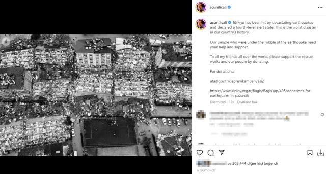 13,6 milyon takipçisi bulunan Acun Ilıcalı, Instagram hesabından yaptığı paylaşımda AFAD ve Kızılay'ın uluslararası hesaplarını paylaşarak şu ifadeleri kullandı: "Türkiye yıkıcı depremlerle sarsıldı ve dördüncü seviye alarm durumu ilan etti. Bu, ülkemizin tarihindeki en büyük felakettir. Enkaz altında kalan insanlarımızın sizlerin yardım ve desteğine ihtiyacı var. Dünyanın her yerindeki tüm dostlarım, lütfen bağış yaparak kurtarma çalışmalarına ve halkımıza destek olun."