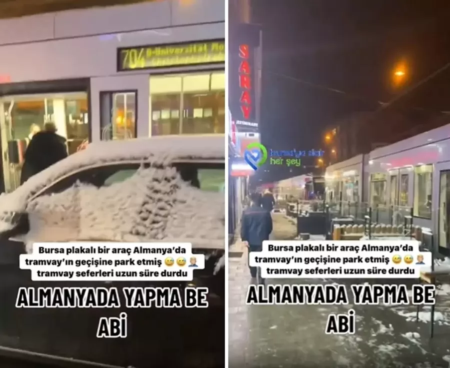 Bir Türk vatandaşının Bursa plakalı aracıyla Almanya'ya gelen ve aracını tramvay yoluna park ederek şehir trafiğini felç etmesi, o anları kaydeden bir Türk vatandaşı tarafından sosyal medyada paylaşıldı.