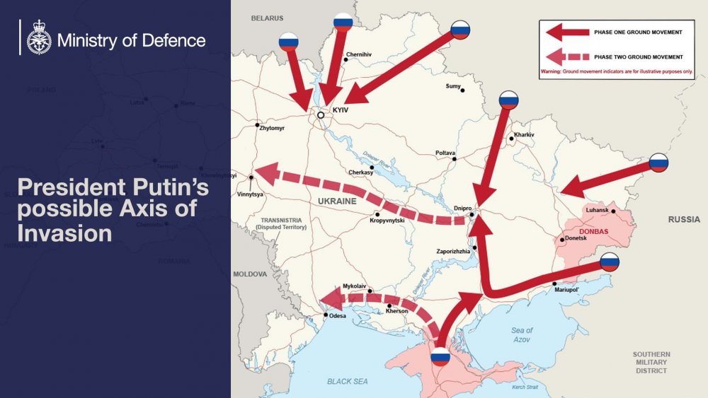 Savunma Bakanlığı, “Başkan Putin'in muhtemel işgal ekseni gösterilmektedir” başlığıyla 2 aşamalı muhtemel işgal planına ait paylaştığı haritada, birinci aşamada Rusya'nın Belarus sınırı boyunca iki noktadan ve Rusya'nın batı sınırından bir noktadan Kiev'e doğru kara harekatı gerçekleştirebileceğini belirtti. Haritada ayrıca, iki noktadan Dnipro'ya, Kırım'dan Mariupol'a ve Rusya sınırından Luhansk yönüne doğru potansiyel birinci aşama yer hareketlerine yer verildi.