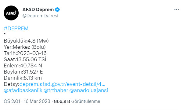 Türkiye'de ise saat 13.55'te Bolu'da 4.8 büyüklüğünde bir deprem oldu. Yerin 8 kilometre derinliğinde meydana gelen sarsıntı, İstanbul dahil olmak üzere çevre illerde de hissedildi. Sarsıntı paniğe neden olurken, kent genelinde herhangi bir olumsuzluk yaşanmadı.