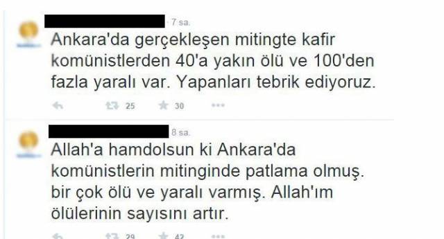 Mesajda, "Ankara'da gerçekleşen mitingde kafir komünistlerden 40'a yakın ölü ve 100'den fazla yaralı var. Yapanları tebrik ediyoruz. Allah'a hamd olsun ki Ankara'da komünistlerin mitinginde patlama olmuş. Birçok ölü ve yaralı varmış. Allah'ım ölülerinin sayısını artır. Halay çeken komünistler bu meydan kanlı meydan sloganı atarken bomba patlıyor. Barış isteyenler bunlar mı? Kanda boğuldunuz hamd olsun" denildi.