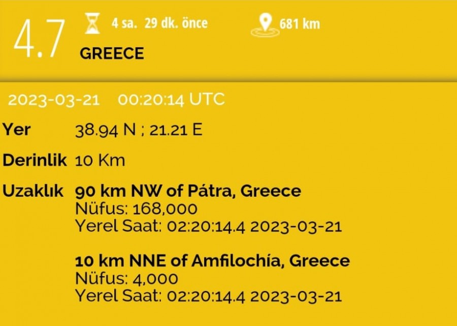'da saat 02.20'de 4.7 büyüklüğünde bir