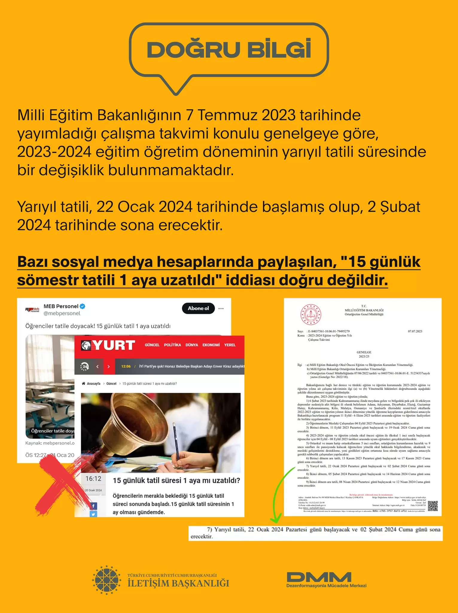 İletişim bakanlığından yapılan açıklamaya göre, Bazı sosyal medya hesaplarında paylaşılan "15 günlük sömestr tatili 1 aya uzatıldı" iddialarına açıklama geldi. İddiaların doğru olmadığını açıklayan bakanlık "Milli Eğitim Bakanlığının 7 Temmuz 2023 tarihinde yayımladığı çalışma takvimi konulu genelgeye göre, 2023 - 2024 eğitim öğretim döneminin yarıyıl tatili süresinde bir değişiklik bulunmamaktadır. Yarıyıl tatili, 22 ocak 2024 tarihinde başlamış olup, 2 şubat 2024 tarihinde sona erecektir." açıklaması yapıldı.