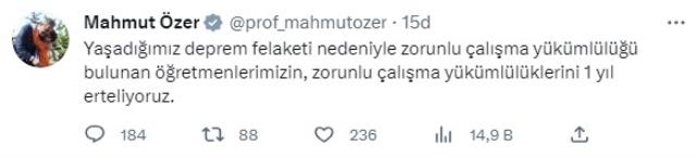 Bakan Mahmut Özer, sosyal medya hesabından yaptığı açıklamada "Yaşadığımız deprem felaketi nedeniyle zorunlu çalışma yükümlülüğü bulunan öğretmenlerimizin, zorunlu çalışma yükümlülüklerini 1 yıl erteliyoruz." ifadelerini kullandı.